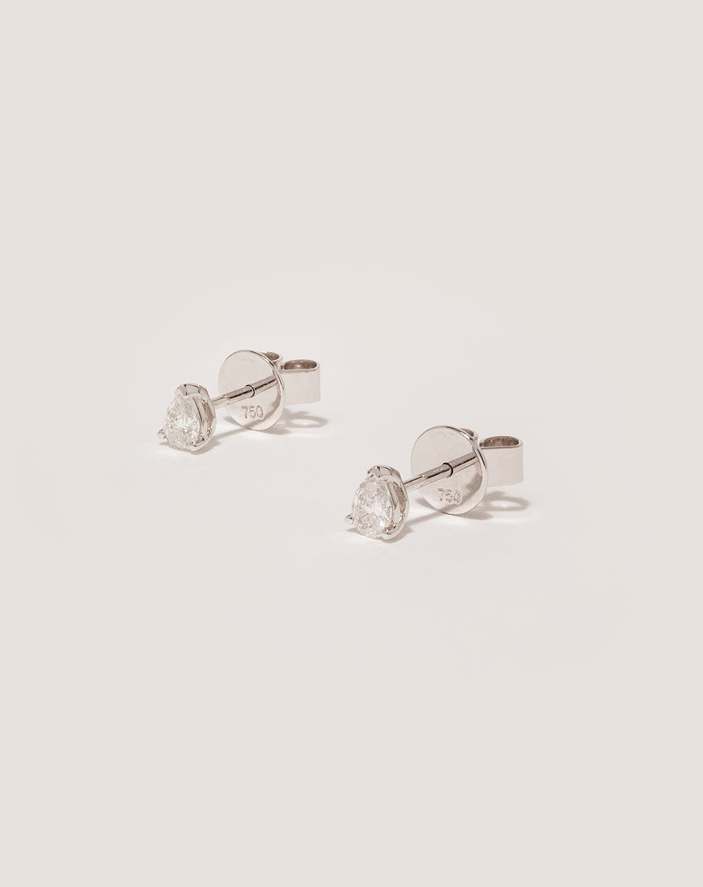 - 18k white gold pear diamonds studs with a contemporary 3 claw setting